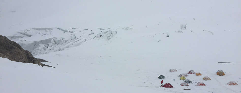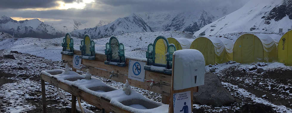 Этот лагерь тоже отлично оборудован, также стоят стационарные большие палатки на двух человек с просторным тамбуром. Это уже похоже на настоящий альплагерь, расположенный в окружении заснеженных гор, ледников. Тем более что по вечерам из столовой доносятся песни под гитару. Подзарядить телефоны и камеры можно в столовой. Кормят так же очень вкусно и разнообразно.