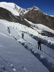 С утра отличная погода, светит солнце. После завтрака вышли на ледник потренироваться и подогнать снаряжение. Погода тёплая, и я, расслабившись, не взял ничего утеплиться.