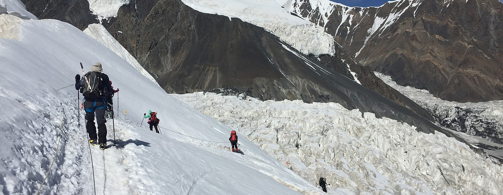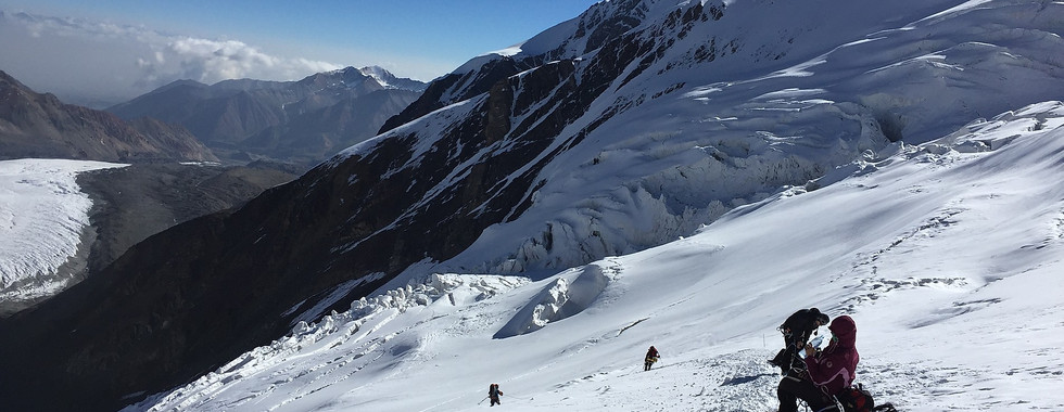 Погода с утра хорошая, от лагеря довольно крутой подъем вдоль скал на седловину. Затем переход по хребту под крутой снежный взлёт перед лагерем на 6100.