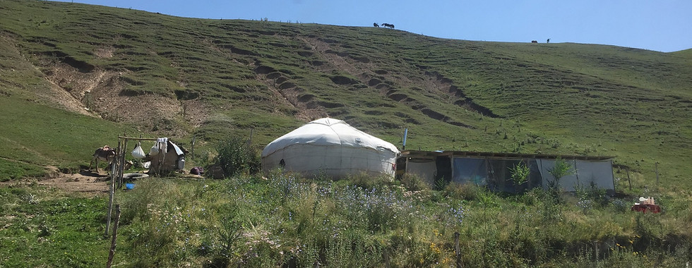 От моста до базового лагеря еще с час езды по бездорожью, мимо юрт скотоводов.