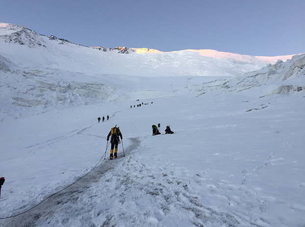 Подъем довольно тяжелый, крутой склон, большое количество трещин т.ч. весь подъем проходит в связках. Сложности добавляло то, что шедшая в нашей связке венгерка шла рваным темпом, часто останавливалась. Из-за чего сбивался темп всей группы.