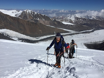 Поднимаемся для акклиматизации на пик Юхина 5100м. У меня самочувствие по-прежнему не очень хорошее, идется тяжело. На подходе к вершине прилетали снежные заряды. А на спуске снег уже пошёл по-настоящему. И шел затем весь день.